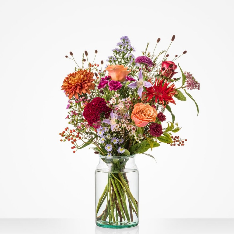 Verwarm jezelf of iemand anders met dit prachtige boeket in zacht lila, warm oranje en dieprood. Een kleurrijke pracht aan seizoensbloemen die ieders hart doet verwarmen. Voor een herfst vol kleur.