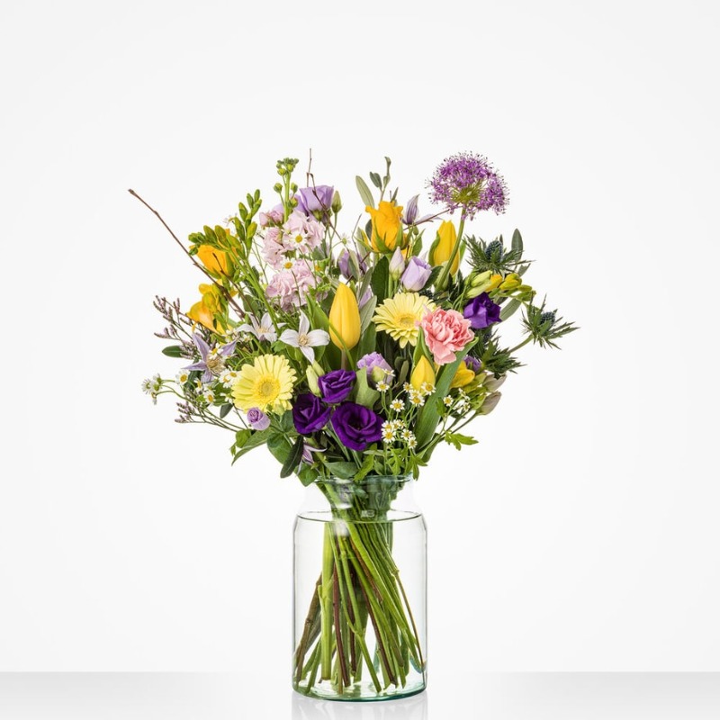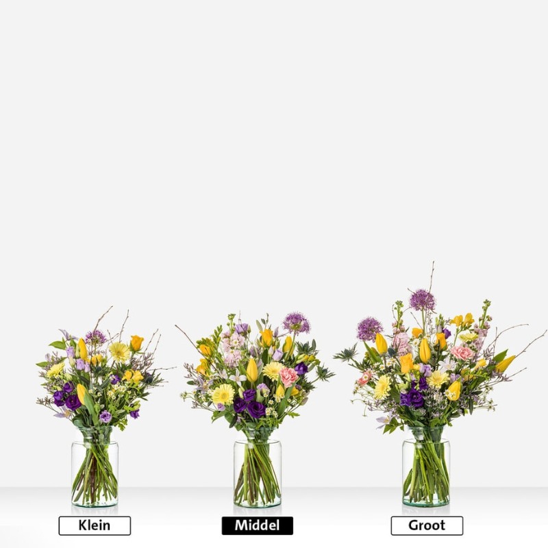 Fijne Paasdagen gegarandeerd met dit vrolijke boeket in lila, roze en paarstinten. Een absolute favoriet voor een vrolijk Pasen. Het perfecte boeket voor op de brunchtafel of als cadeautje voor de gastheer of -vrouw. Tip: bestel een bijpassende vaas of ga voor onze heerlijke chocolaatjes en bonbons en maak de verrassing compleet. Wie wens jij fijne Paasdagen?